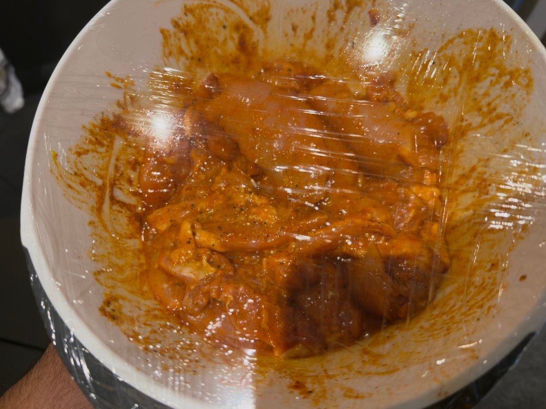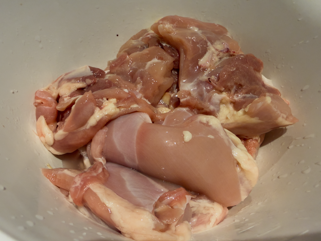 - Измий и подсуши пилешкото месо. Няма нужда да го режещ на ситно – нека си остане на хубави парчета, готови за марината.