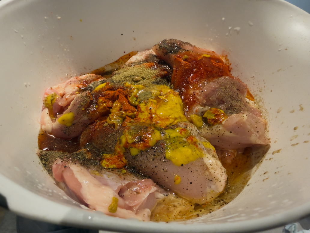 - Сложи пилешкото месо в дълбока купа. Отгоре добави сол, черен пипер, червен пипер, чесън на прах, горчица, зехтин и оцет. После омеси всичко добре с ръце, докато всяко парче е хубаво покрито с ароматите.