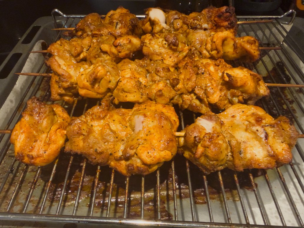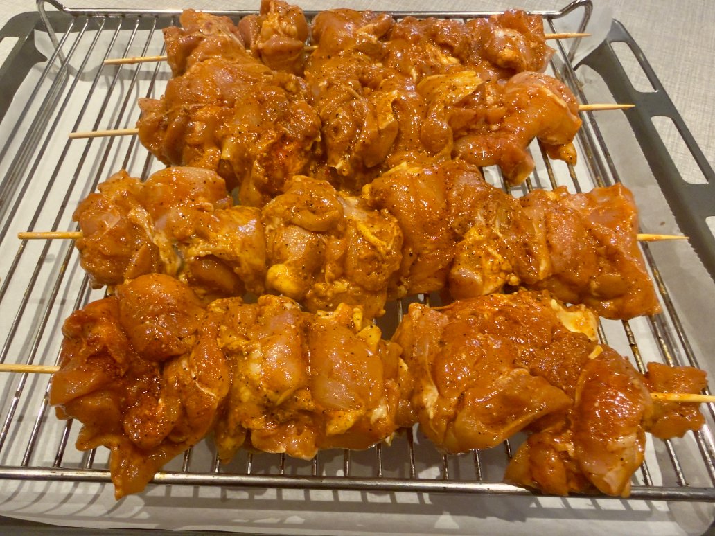 - Извади маринованото пилешко и го нанижи на шишове без да го режеш. Така ще си запази сочността, а после ще можеш да го нарежеш на ленти.