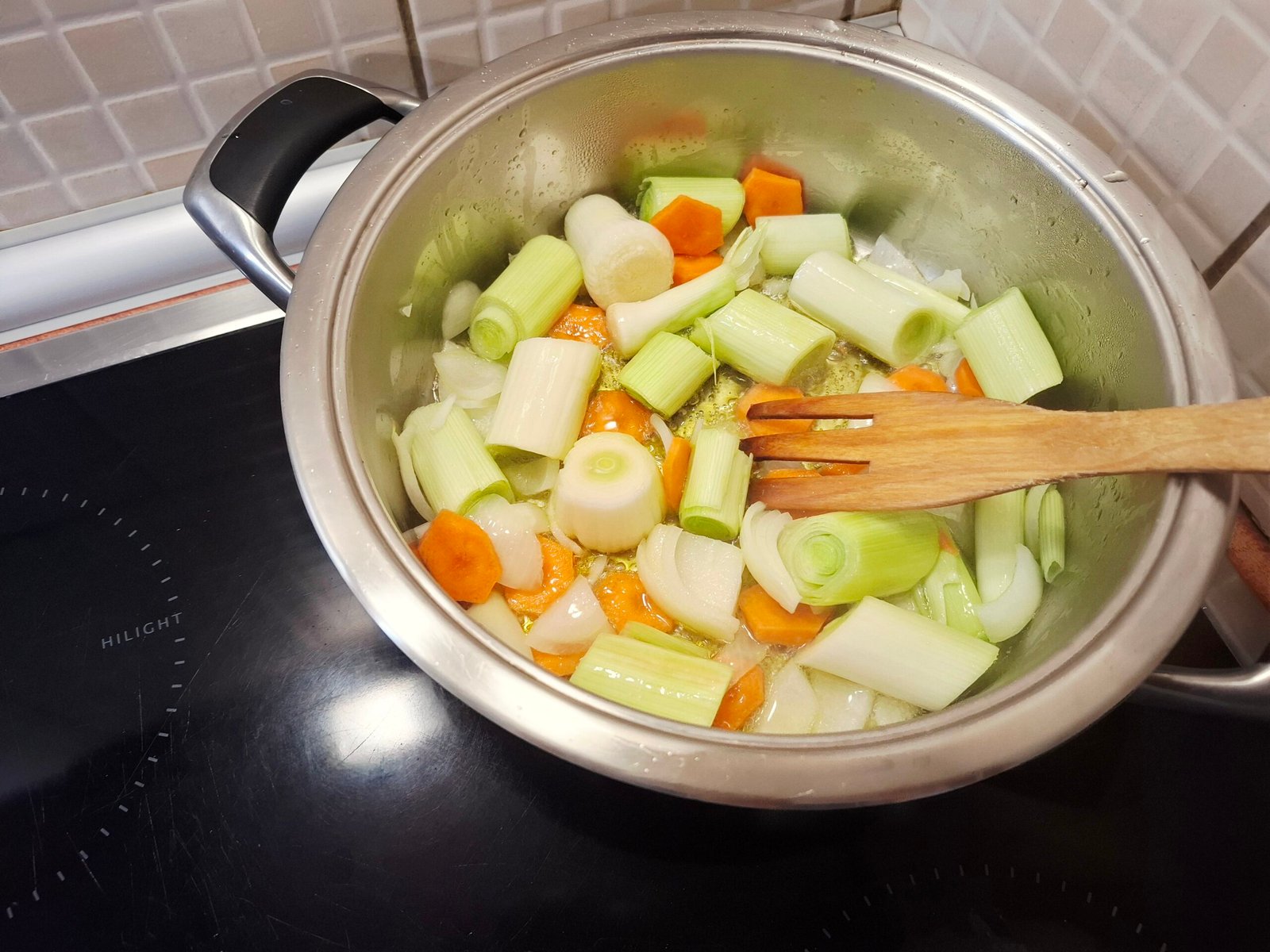 - Загряваме мазнината и запържваме едро нарязания праз,кромид лук и нарязания на кръгчета морков.От праза използваме само бялата част