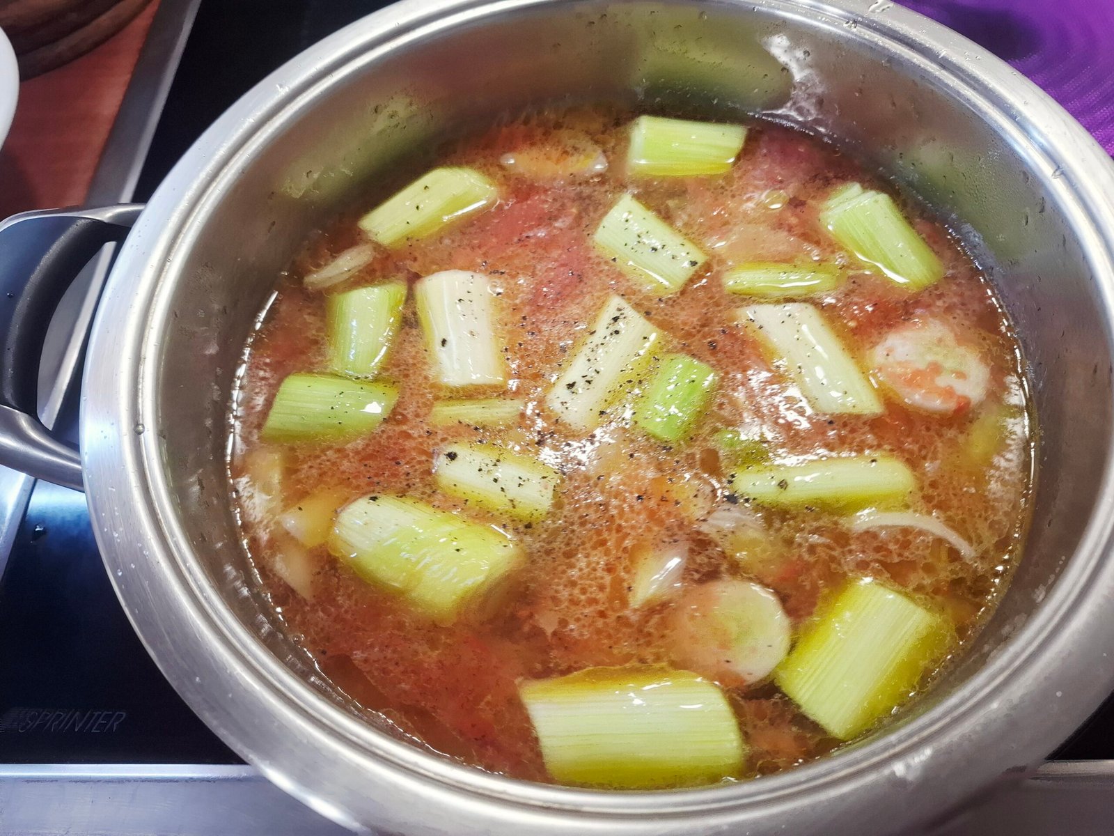 - Сипваме 1 л вода,настърганите домати,телешки бульон,поръсваме с черен пипер и оставяме да ври на умерен огън до омекване на праза.