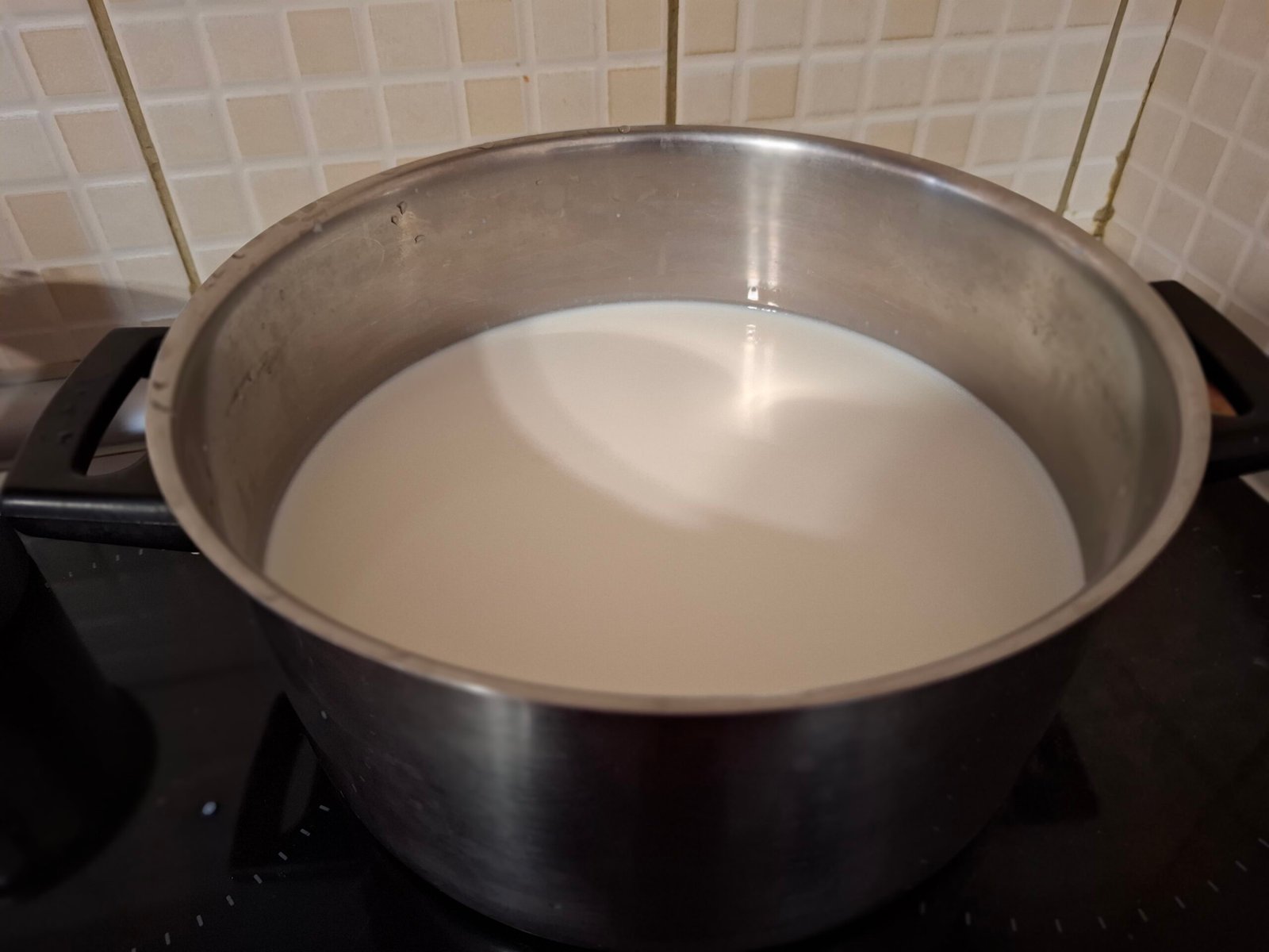 - В предварително измита със студена вода тенджера сипвоме прясното мляко и го поставяме на огъня.