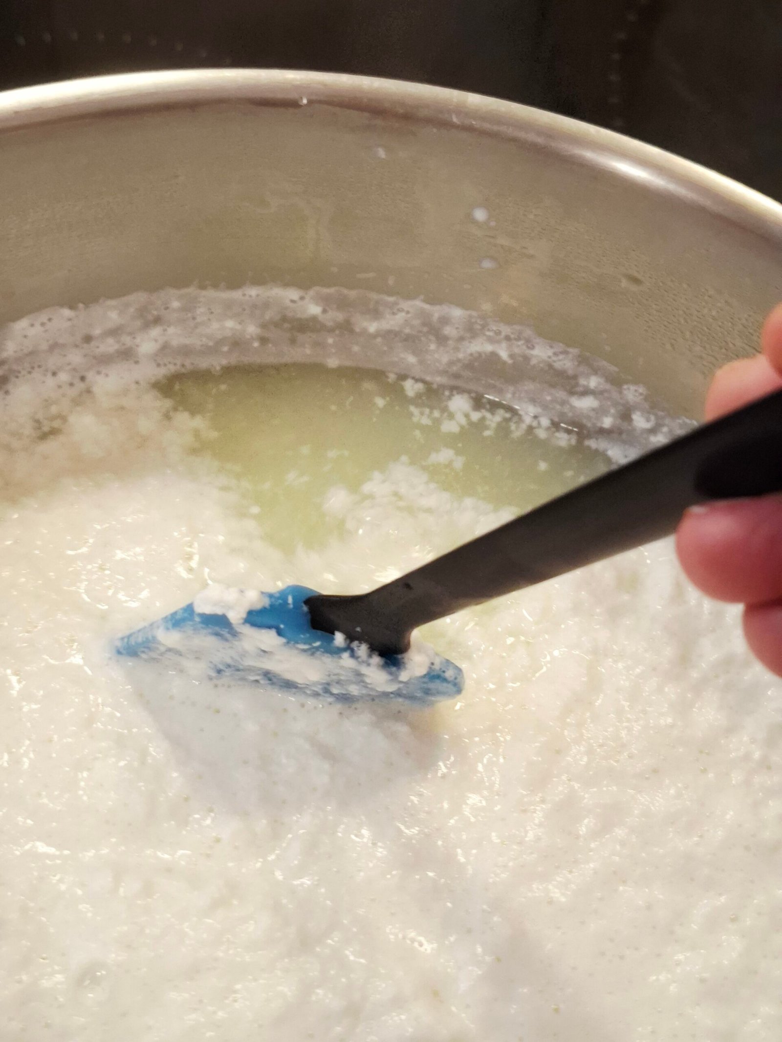 - Малко преди да заври млякото сипваме оцета и бъркаме до зовиране на млякато.Млякото се пресича веднага,оставяме го за няколко секунди да заври и го отстраняваме от огъня.