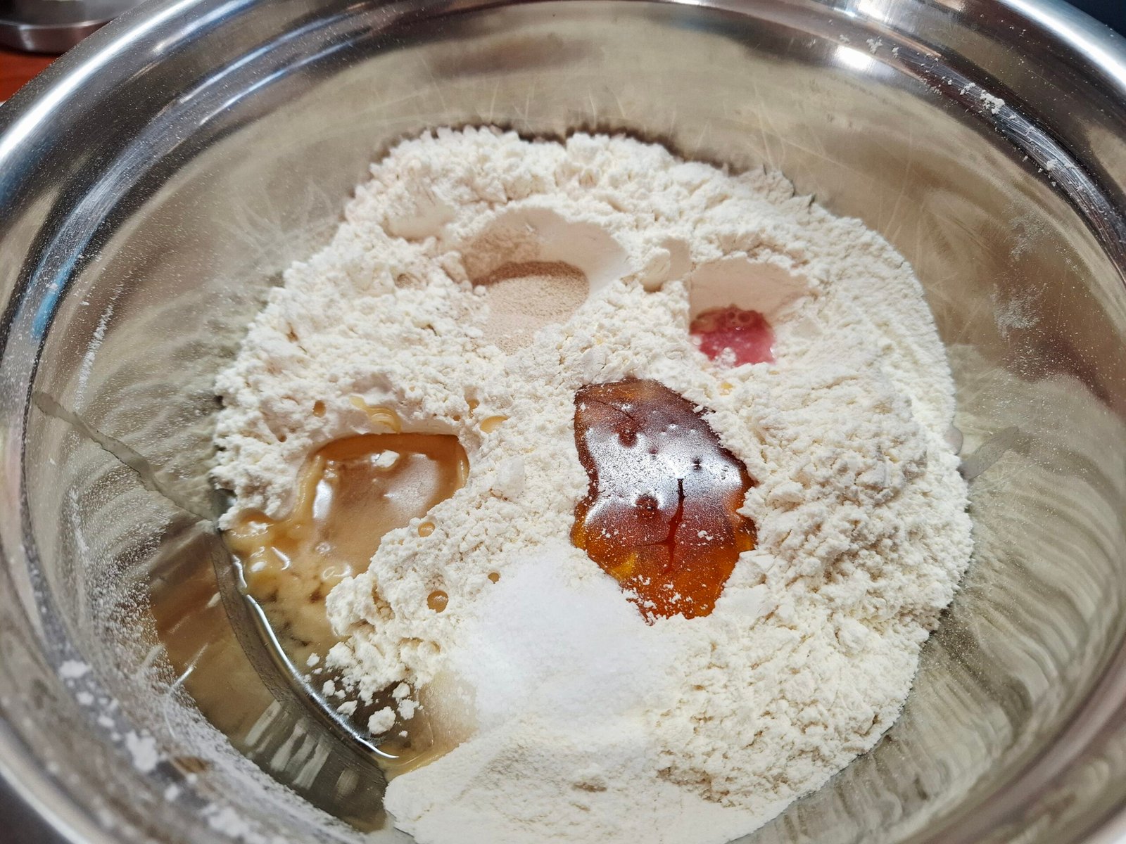 - В купа сипваме пресятото брашно,маята,меда,солта ,оцета и олиото.