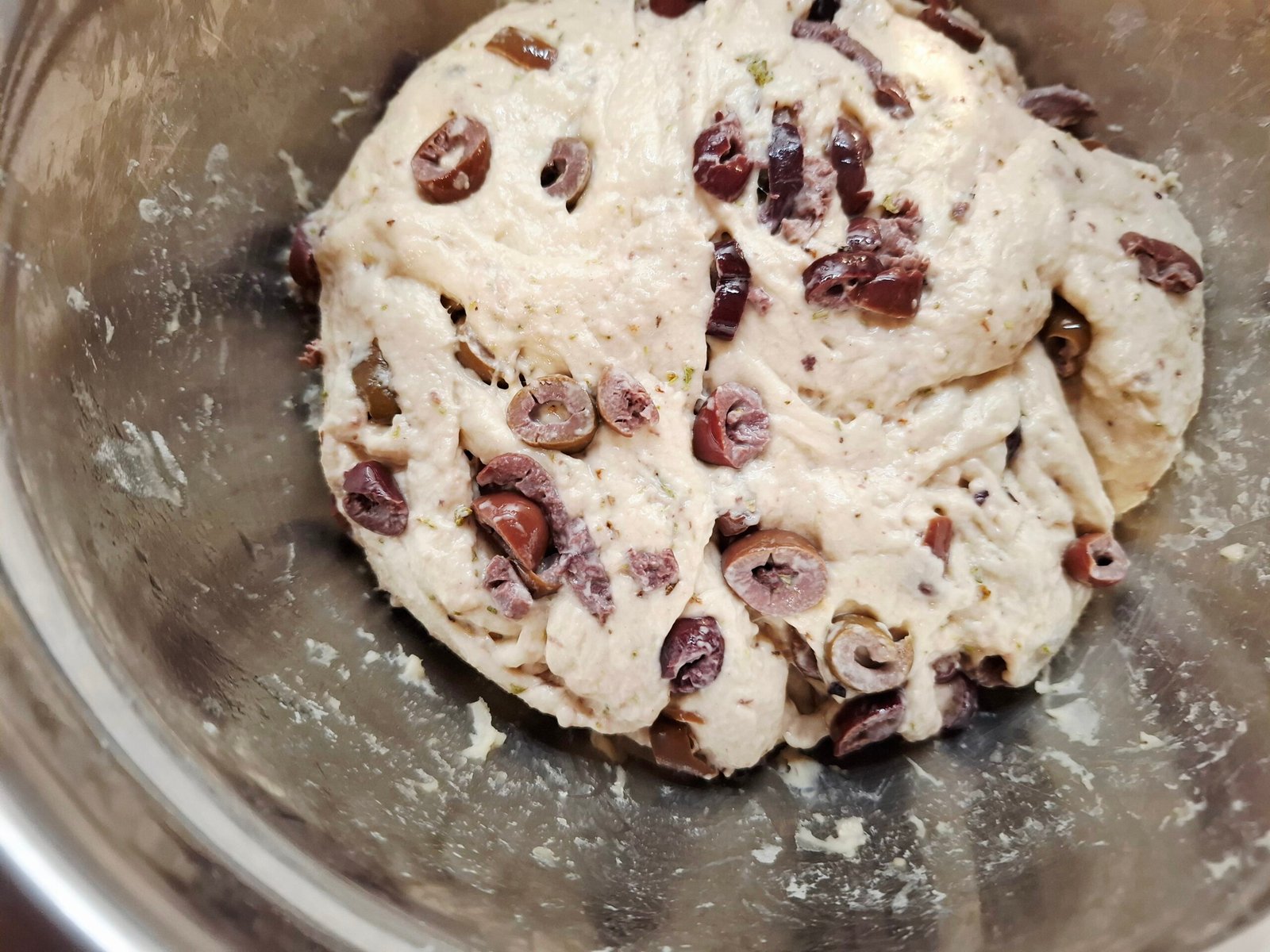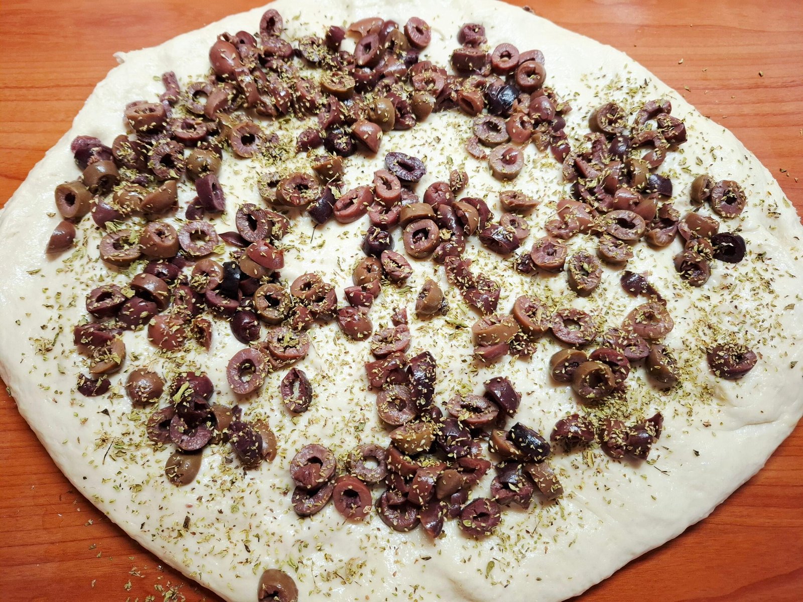 - Изсипвоме тестото върху намазан с олио плот,поръсваме отгоре нарязаните маслини,риган и доомесваме като се стараем да оформим тестото на топка.