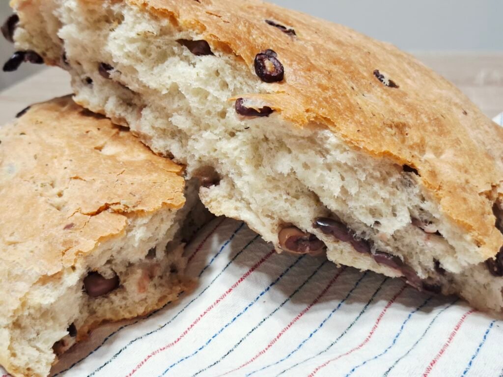 След като втаса, тестото се превръща в пухкава топка, която влизайки във фурната, запълва кухнята с онзи магически аромат на домашен хляб. Кората става леко златиста, вътрешността – мека, еластична и нежна. Маслините придават изненада на всяка хапка – понякога соленка, понякога леко горчива, но винаги в баланс с мекото тесто.