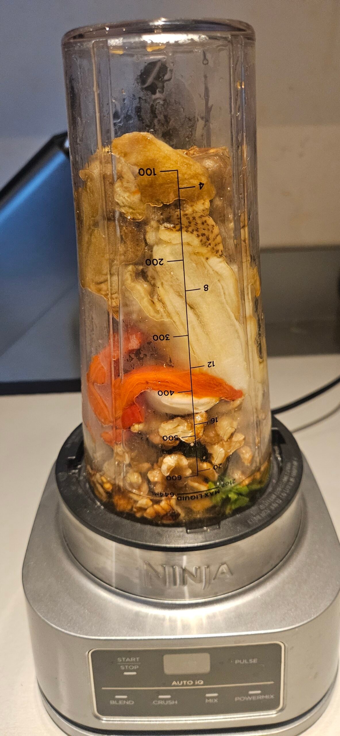 - Слагаме в блендер: печените зеленчуци, орехите, чесъна, солта и зехтина. Блендираме до гладка или леко текстурирана смес – както ви харесва.