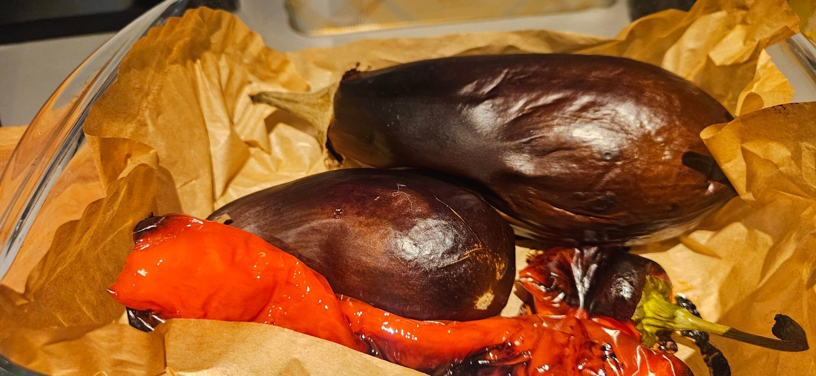 - Изпичаме патладжаните и чушката – на грил, котлон или във фурна, докато кожата почернее, а вътрешността омекне напълно. Оставяме ги да се задушат леко в купа, покрита с капак.