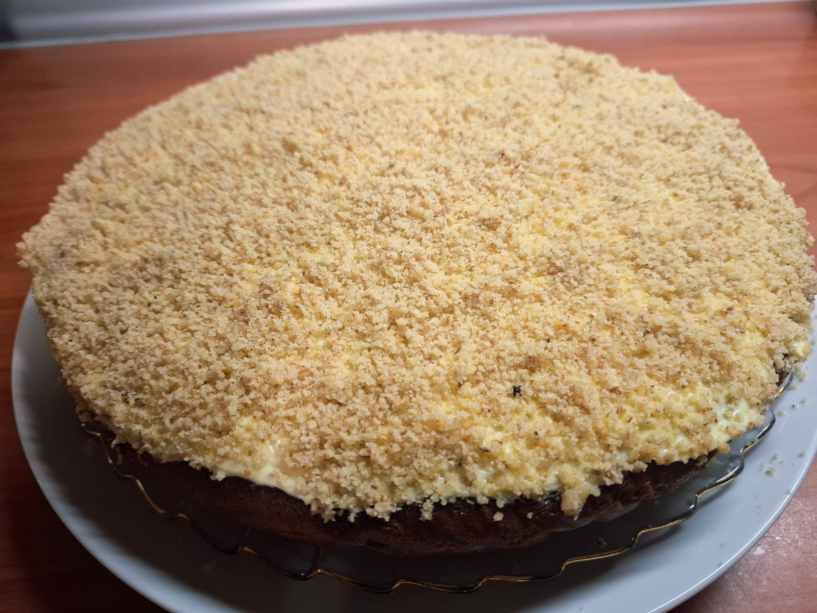 6. Намазваме сладкиша отгоре с масления крем и поръсваме със смлени орехи.
